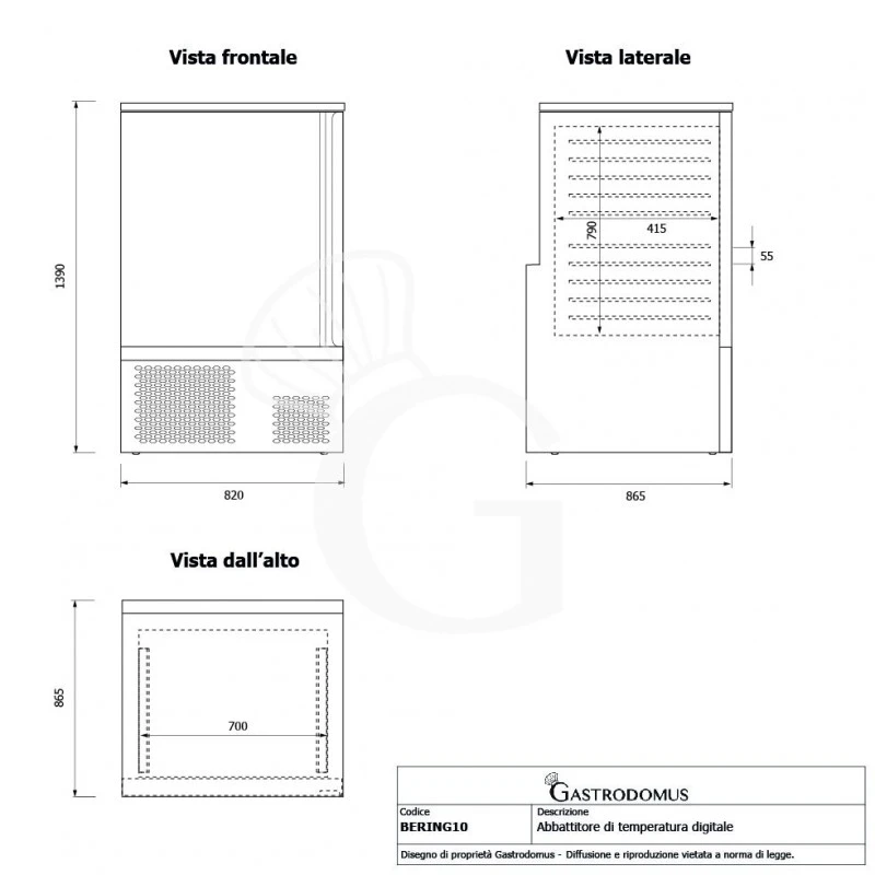 Abbattitore di temperatura digitale Trifase per 10 teglie GN1/1 o 600×400 mm , temperatura -18°C/+3°C, con ruote montate, in acciaio inox.