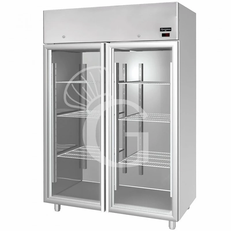 Armadio refrigerato ventilato in acciaio inox con 2 porte in vetro, capacità 1400 litri e temperatura -2°C/+10°C.