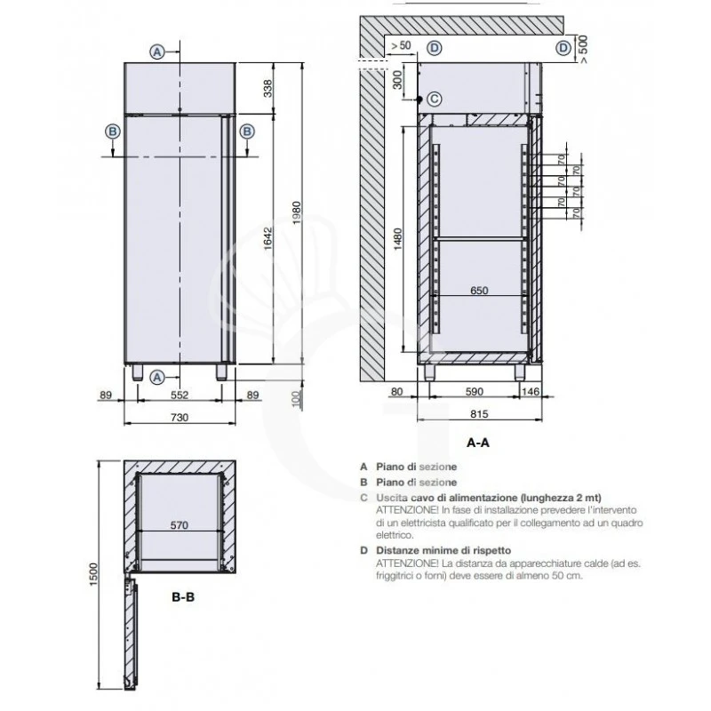 Viste le dimensioni, l’armadio refrigerato statico rientra all’interno della categoria di litraggio dei frigoriferi inferiore o uguale a 700 litri