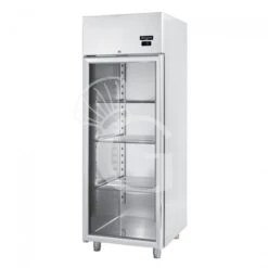 Armadio refrigerato ventilato in acciaio inox con porta in vetro, capacità 600 litri e temperatura -2°C/+10°C.