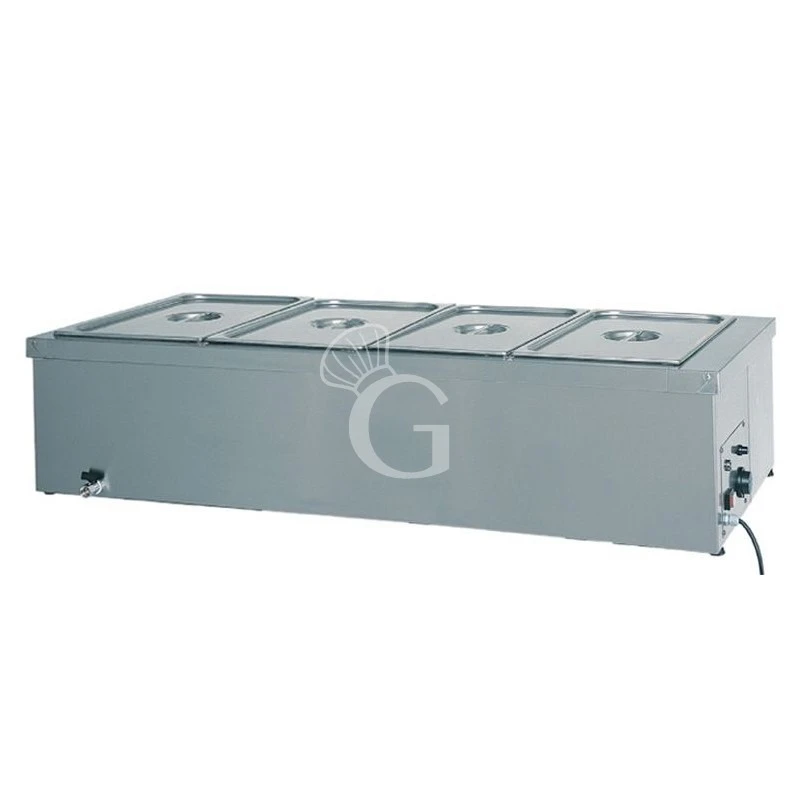 La tavola calda da banco a bagnomaria è utile per mantenere in temperatura cibi e composti. Questi ultimi vengono infatti messi all’interno di un recipiente posto a sua volta all’interno di una vasca con acqua calda scaldata tramite resistenze elettriche. L’apparecchio è adatto per mantenere in temperatura pietanze asciutte come ad esempio carni, verdure e pasta.