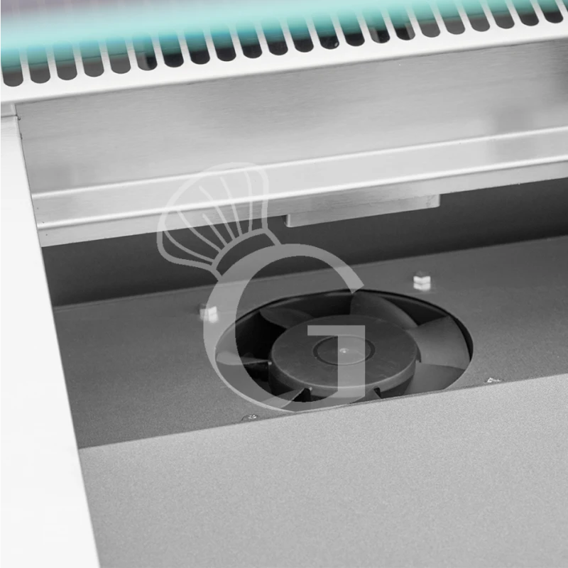 La vetrina ha una refrigerazione ventilata con aggregato di raffreddamento interno alla macchina e una temperatura di esercizio che si attesta in un range positivo da +0°C a +5° con una temperatura ambiente di 25°C e un’umidità dell’aria fino al 60%.