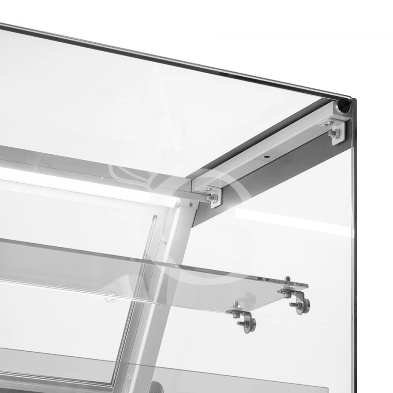 L’apparecchio presenta un’estesa area di esposizione costruita in acciaio, visibile attraverso il vetro dritto e i lati anch’essi in vetro. La vetrina espositiva ha in dotazione un ripiano di vetro intermedio e un vetro anticondensa.
