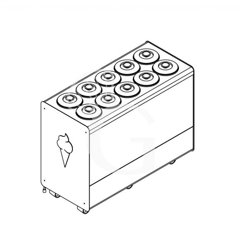 Banco gelato con vasca realizzata in poliuretano ecologico coibentato in monoblocco con densità 40 kg/m3 e spessore coibentazione 55mm per le pareti laterali e 65 mm per il fondo vasca. Rivestimento interno in acciaio inox 18/10 AISI 304 ed esterno (fianchi, schiena, fondo) in lamiera zincata con frontale (lato operatore) in acciaio inox bianco 18/10 AISI 304 (finitura BA). I fianchi sono in acciaio bianco con elemento decorativo (cono gelato) in inox lucido.