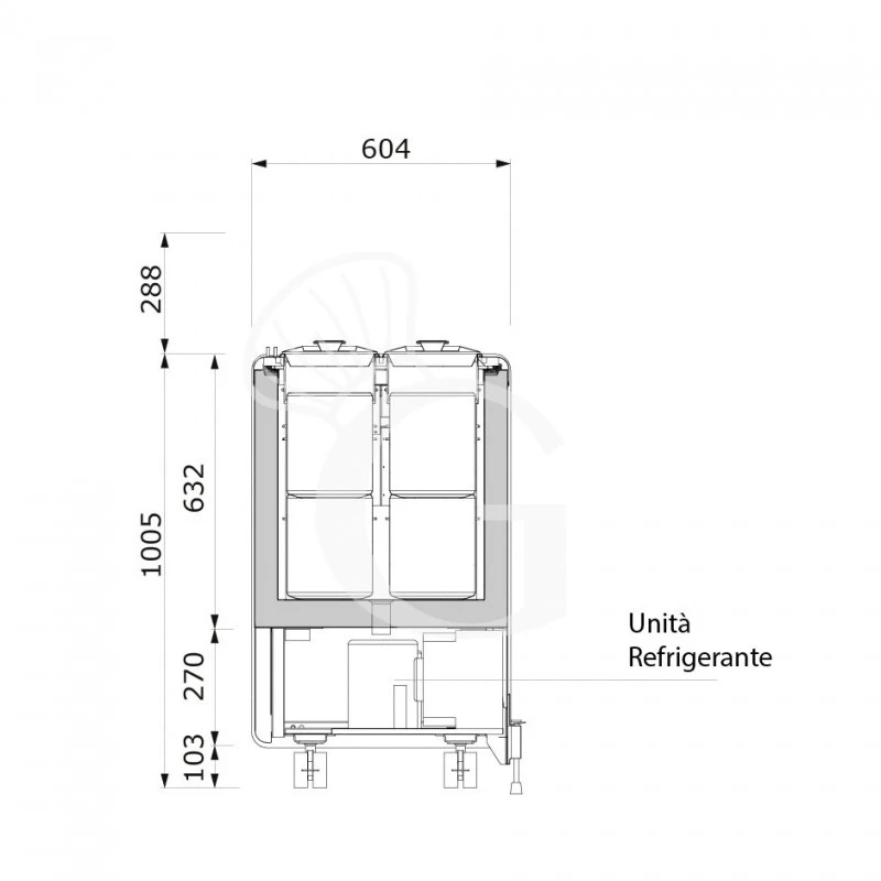 Refrigerazione ventilata collegata con unità ermetica condensata ad aria alloggiata sotto la vasca, all’interno della struttura portante. Il quadro comandi elettronico è completo di termostato digitale e interruttore generale.