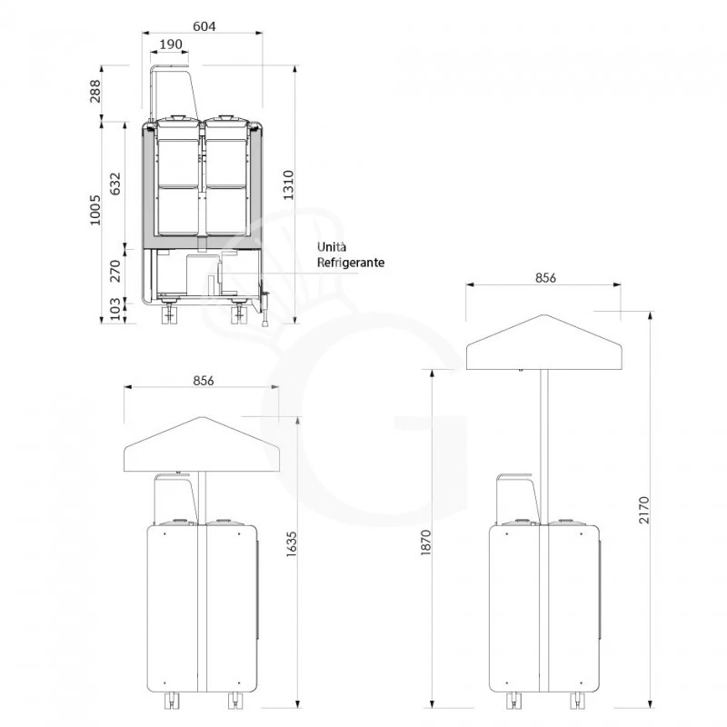Refrigerazione ventilata collegata con unità ermetica condensata ad aria alloggiata sotto la vasca, all’interno della struttura portante. Il quadro comandi elettronico è completo di termostato digitale e interruttore generale.