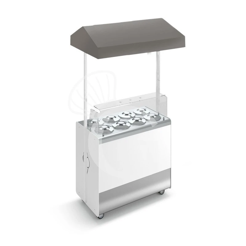 Banco gelato ventilato su ruote Joy 8 pozzetti con riserva e cappottina telescopica grigio, L 1076 x P 856 x H 2170 mm.