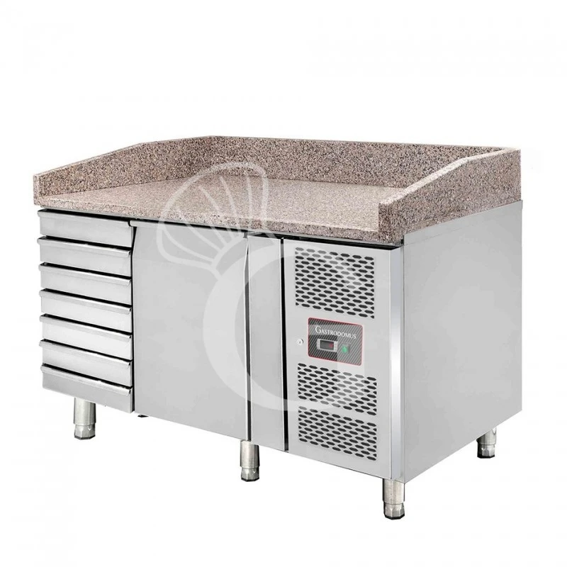 Banco pizza refrigerato ventilato predisposto per teglie di dimensioni 600 x 400 mm, provvisto di 1 porta, cassettiera con 7 cassetti e piano in granito.