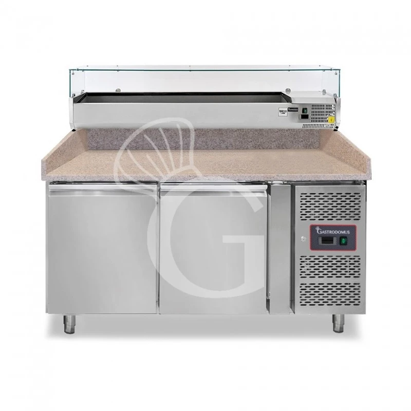 Banco pizza refrigerato ventilato, provvisto di 2 porte con piano in granito e vetrina predisposta per 7 bacinelle GN1/4.