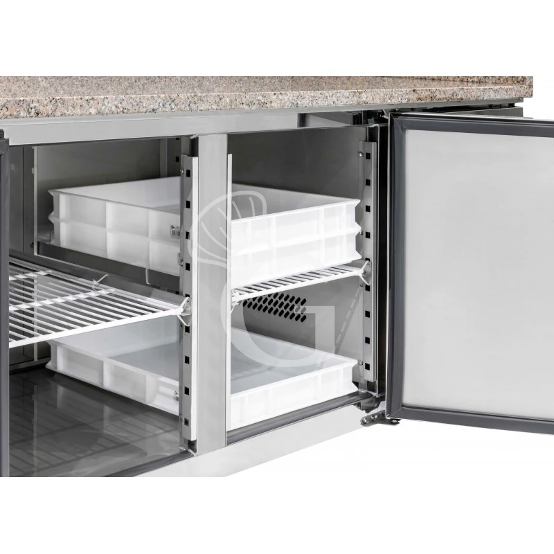 Banco pizza refrigerato ventilato predisposto per teglie di dimensioni 600 x 400 mm, provvisto di 3 porte con piano in granito.