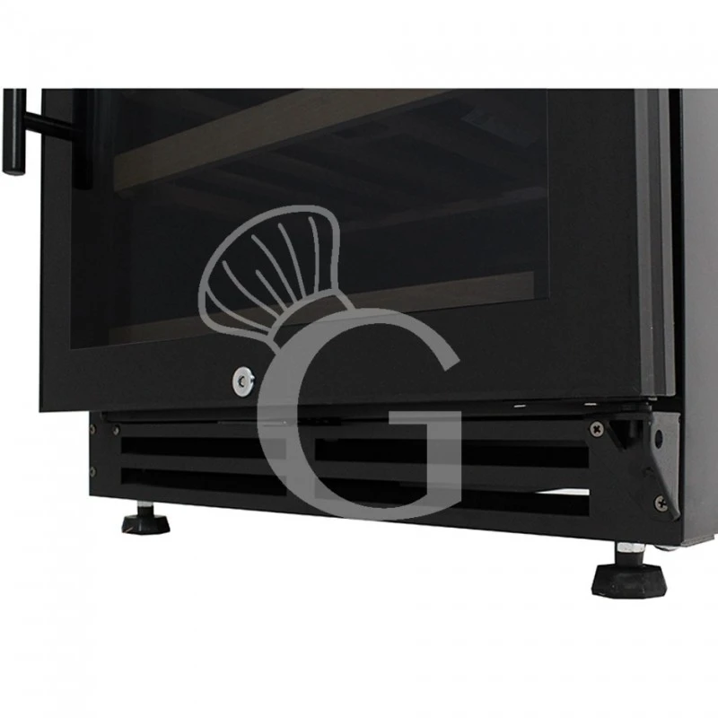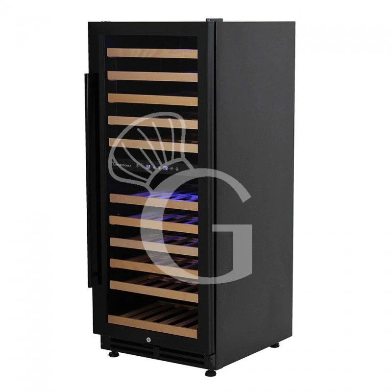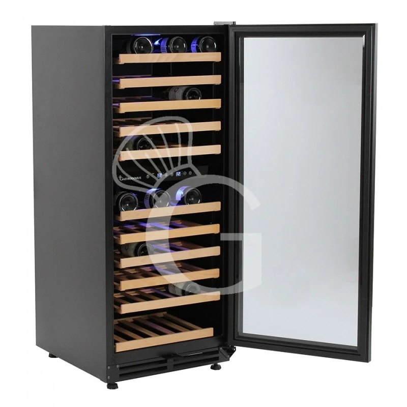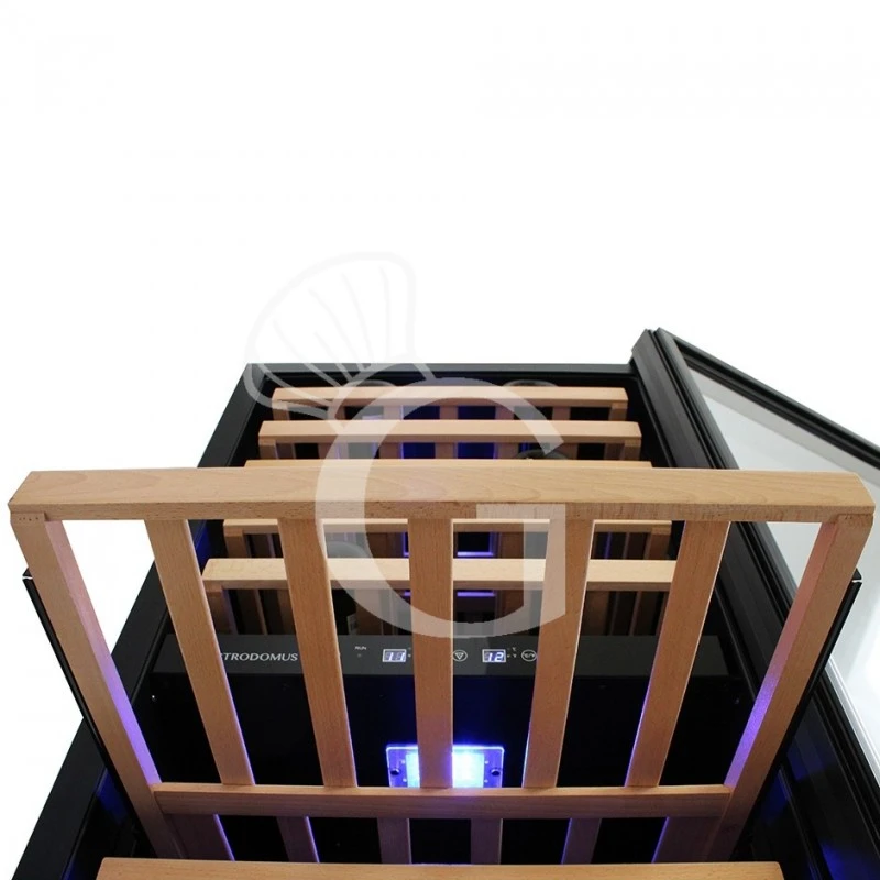 L’apparecchio ha una capacità di circa 121 bottiglie di capacità 750 ml (dimensione bottiglia: diametro 80 mm x H 300 mm) e presenta due zone refrigerate con la possibilità di regolare la temperatura in modo indipendente in un range da +5°C/+12°C nel vano superiore, e da +12°C/+22°C nel vano inferiore.