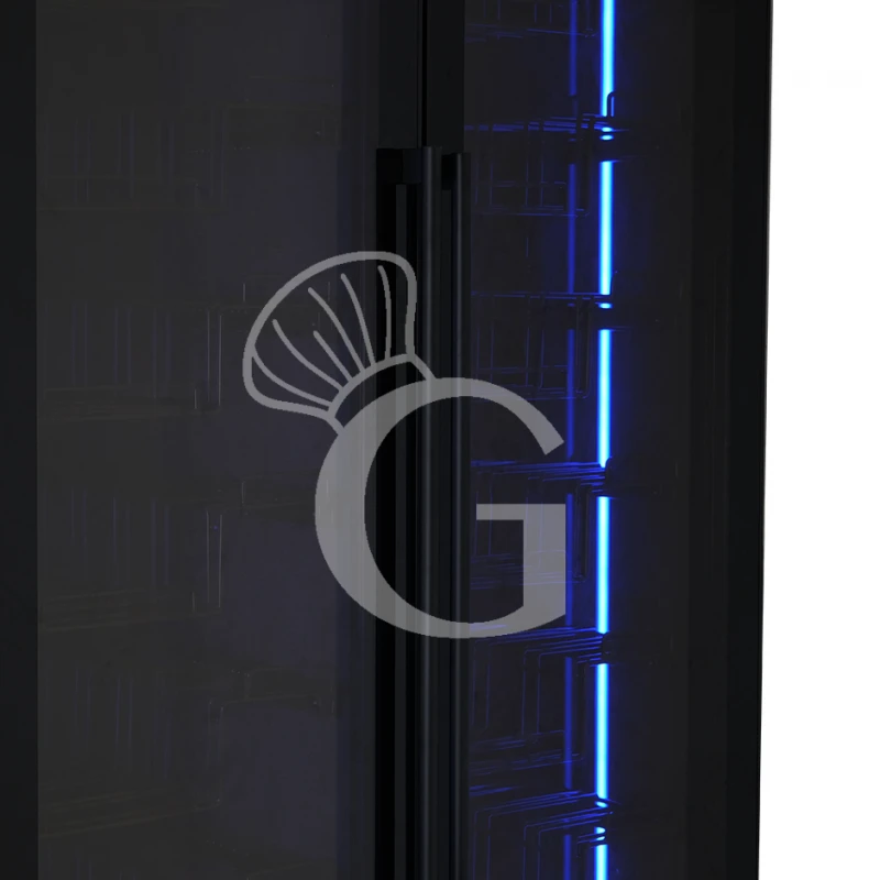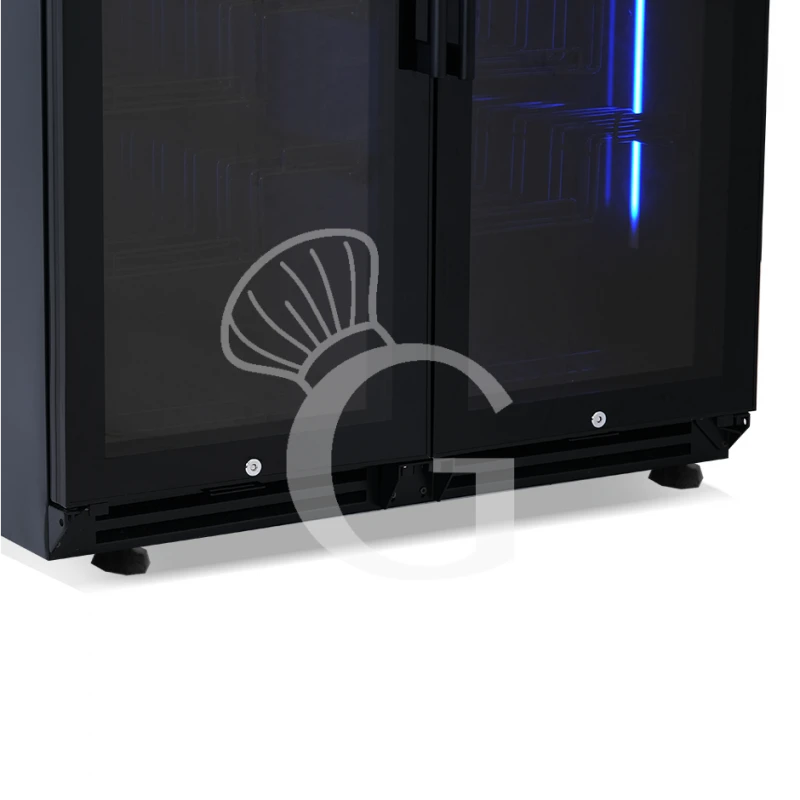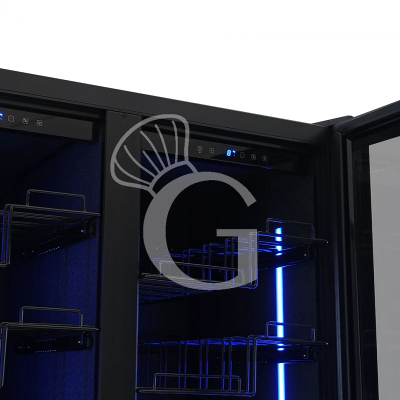 L’apparecchio ha una capacità di circa 190 bottiglie di capacità 750 ml (dimensione bottiglia: diametro 80 mm x H 300 mm) e presenta due zone refrigerate con la possibilità di regolare la temperatura in modo indipendente in un range da +5°C/+22°C nella parte destra, e da +5°C/+22°C nella parte sinistra.