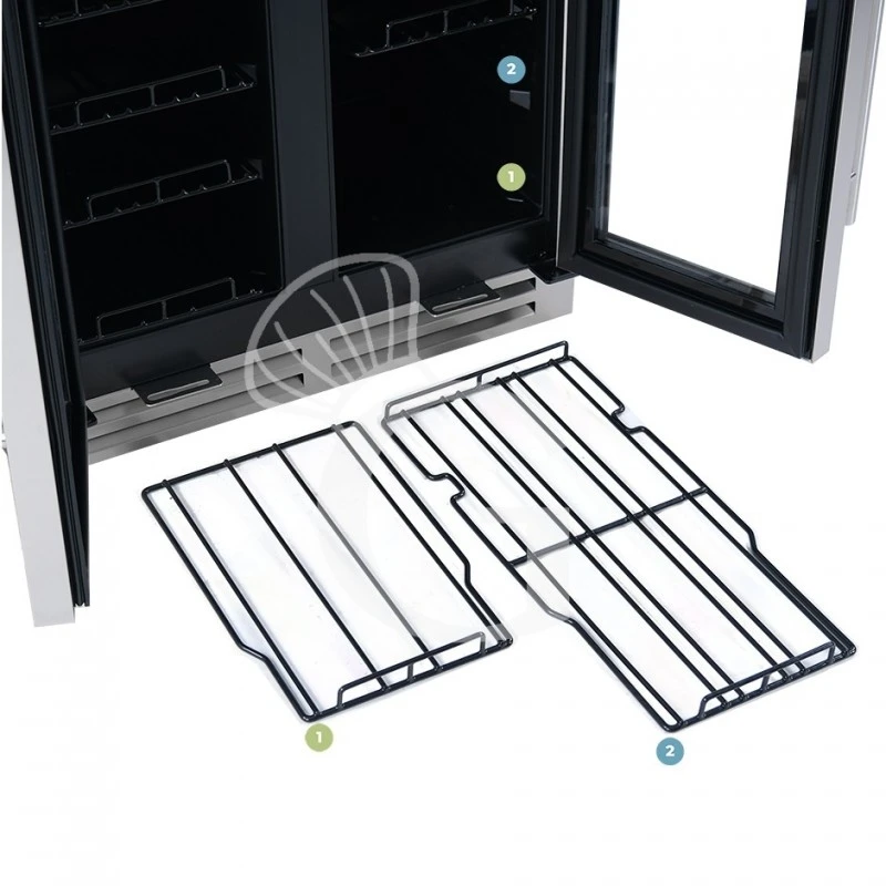 L’apparecchio ha una capacità di circa 34 bottiglie di capacità 750 ml (dimensione bottiglia: diametro 80 mm x H 300 mm) e presenta due zone refrigerate con la possibilità di regolare la temperatura in un range +5°C/+12°C nel vano superiore, e +12°C/+22°C nel vano inferiore.