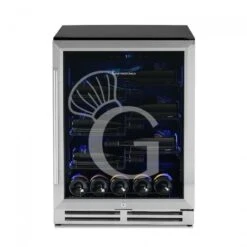 L’apparecchio ha una capacità di circa 36 bottiglie di capacità 750 ml (dimensione bottiglia: diametro 80 mm x H 300 mm) e presenta una zona refrigerata con la possibilità di regolare la temperatura in un range +5°C/+22°C.
