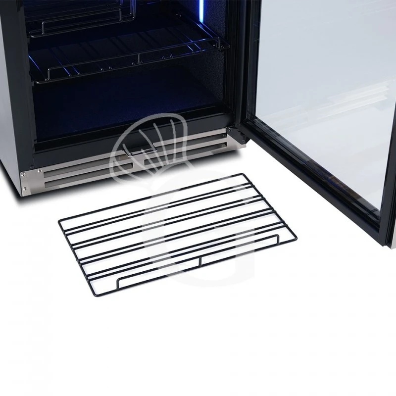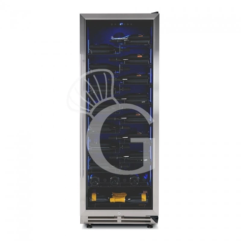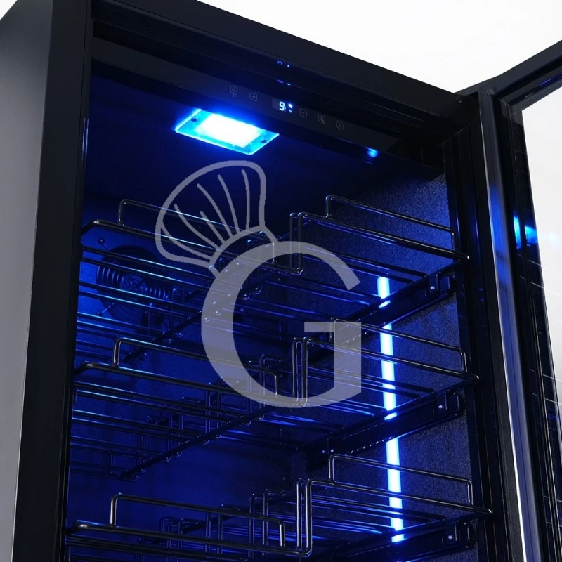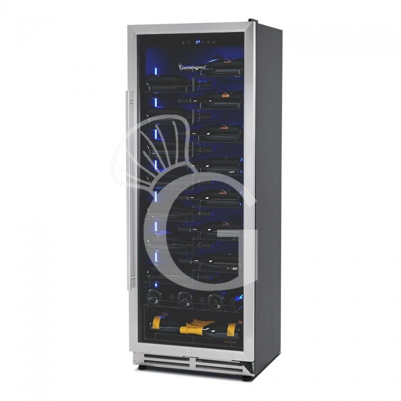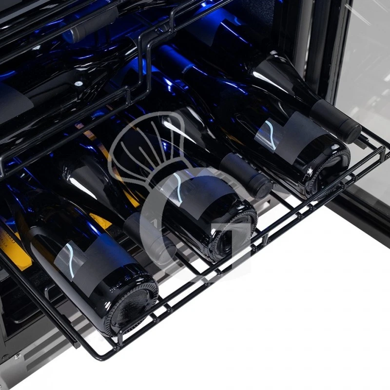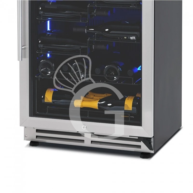 L’apparecchio ha una capacità di circa 67 bottiglie di capacità 750 ml (dimensione bottiglia: diametro 80 mm x H 300 mm) e presenta una zona refrigerata con la possibilità di regolare la temperatura in modo indipendente in un range da +5°C/+22°C nel vano.
