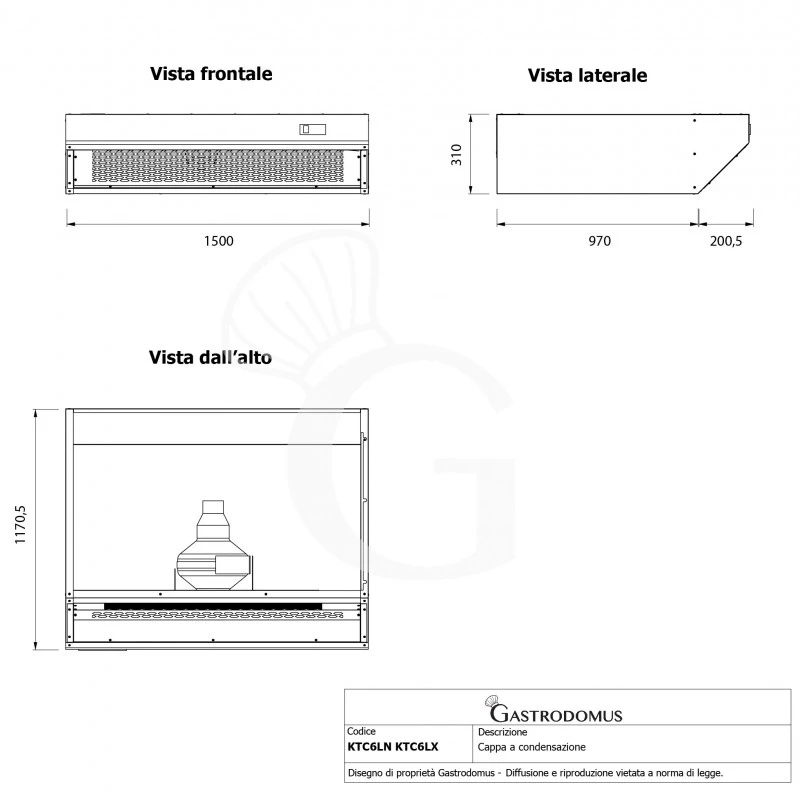 Cappa a condensazione color nero dimensioni L1500 mm x P 1170,5 mm x H 310 mm.