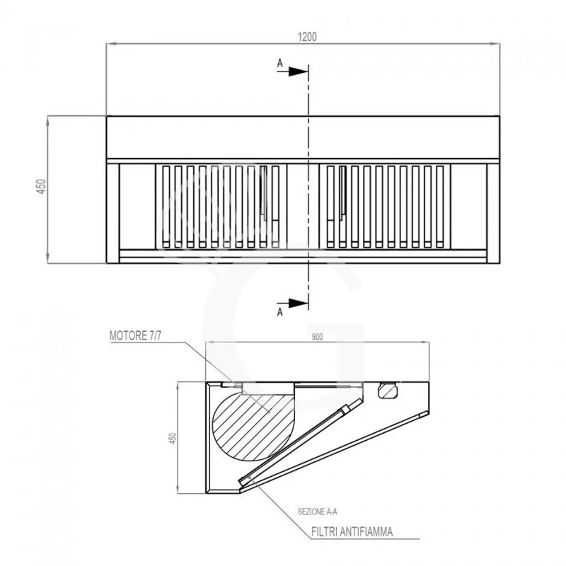 Cappa Snack a parete con motore full optional L1200xP900xH450mm.