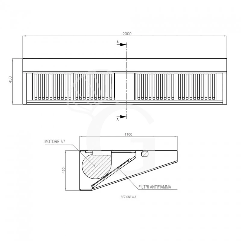 Cappa Snack a parete con motore full optional L2000xP1100xH450mm.