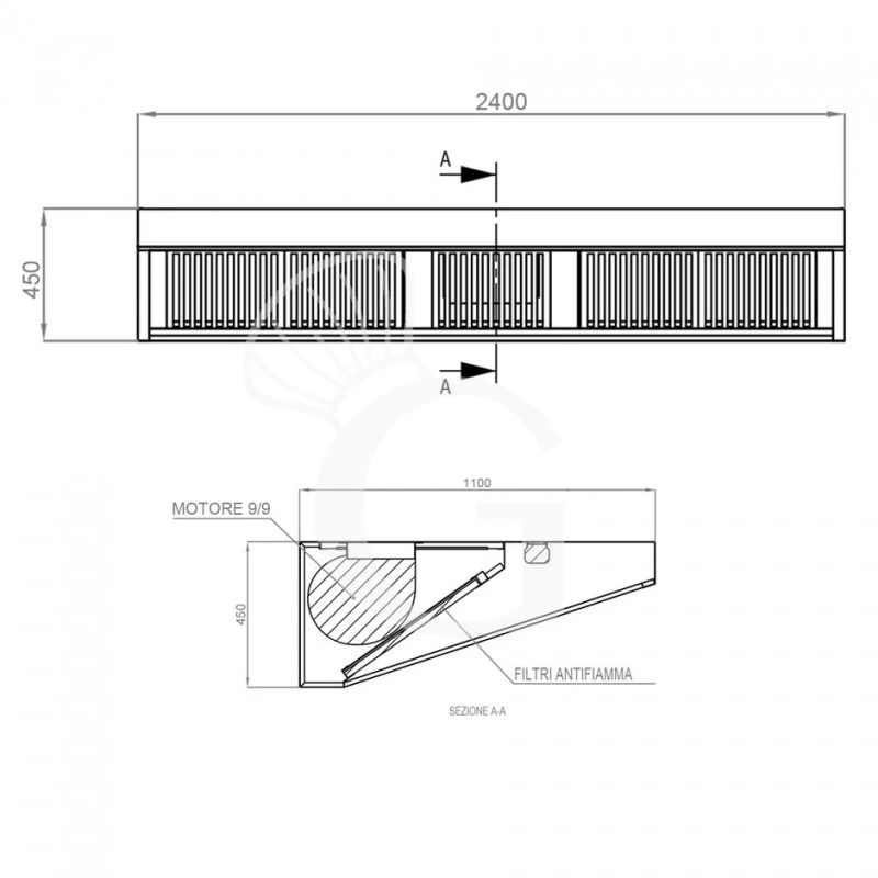 Cappa Snack a parete con motore full optional L2400xP1100xH450mm.