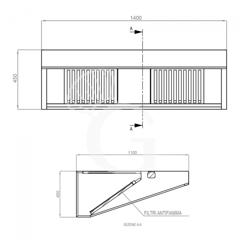 Cappa Snack a parete senza motore L1400xP1100xH450mm.