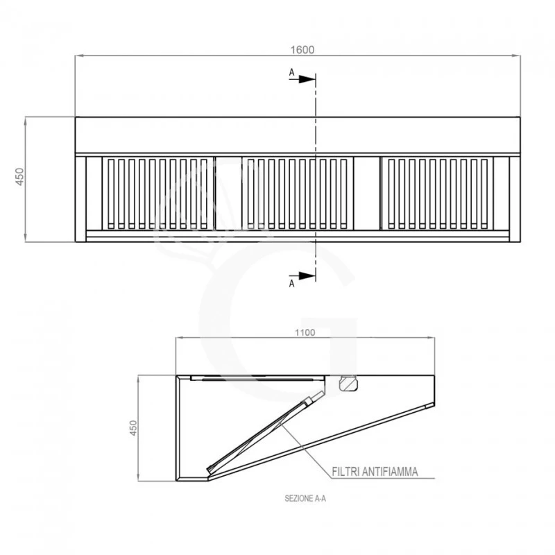 Cappa Snack a parete senza motore L1600xP1100xH450mm.