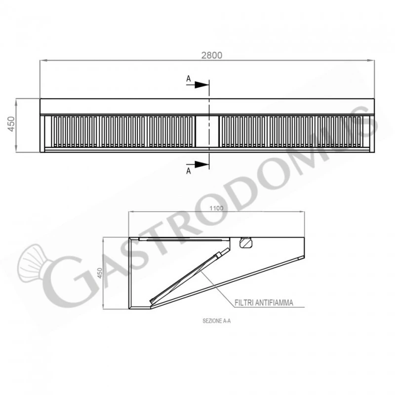 Cappa Snack a parete senza motore L2800xP1100xH450mm.