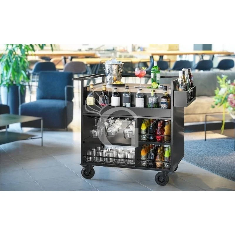 Il Carrello da cocktail in acciaio inox al carbonio con rivestimento antiruggine e vernice nera satinata è dotato di 4 ruote piroettanti di cui due con freno.