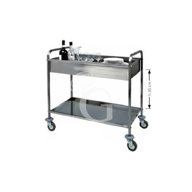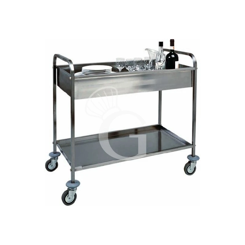 Il carrello di servizio in acciaio inox per sbarazzo ha struttura tubolare in acciaio inox AISI304 20×20 mm, vasca in acciaio inox AISI304 di altezza 150 mm e un piano inferiore in acciaio inox piegato.