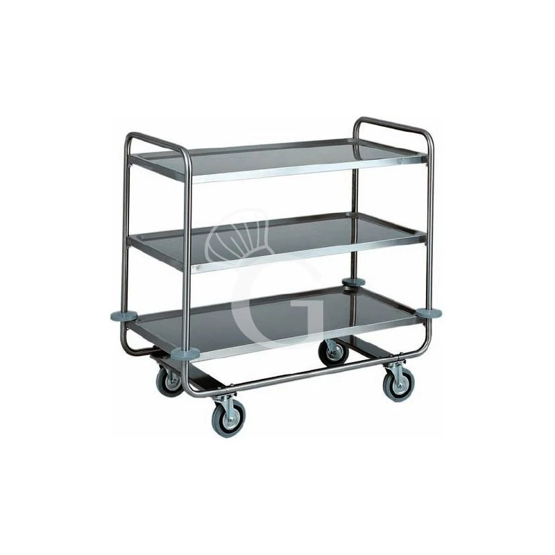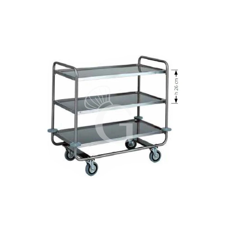Il carrello ha una struttura tubolare in acciaio inox AISI304, tonda di diametro 25 mm, alto spessore con piani stampati in forma di vassoio con bordi arrotondati; tre piani insonorizzati con finitura satinata.