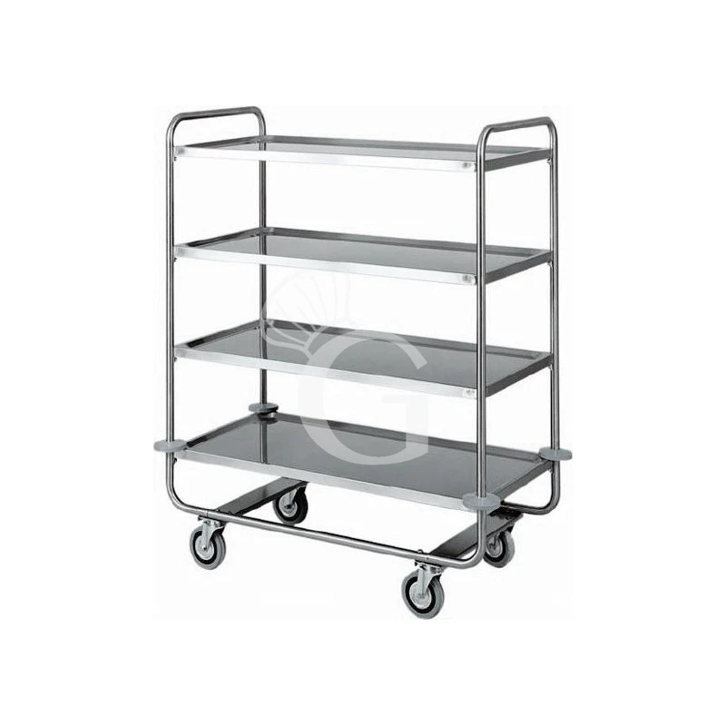 Il carrello ha una struttura tubolare in acciaio inox AISI304, tonda di diametro 25 mm, alto spessore con piani stampati in forma di vassoio con bordi arrotondati; quattro piani insonorizzati con finitura satinata.