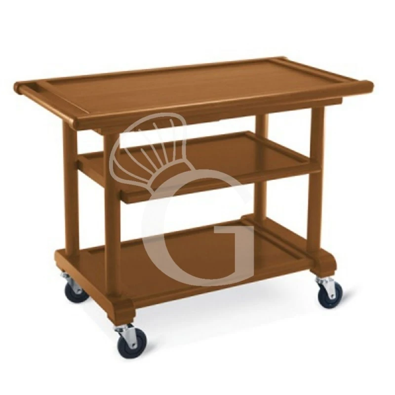 Il carrello ha una struttura in legno massello e i piani in multistrato con cornici e maniglie in massello color noce.
