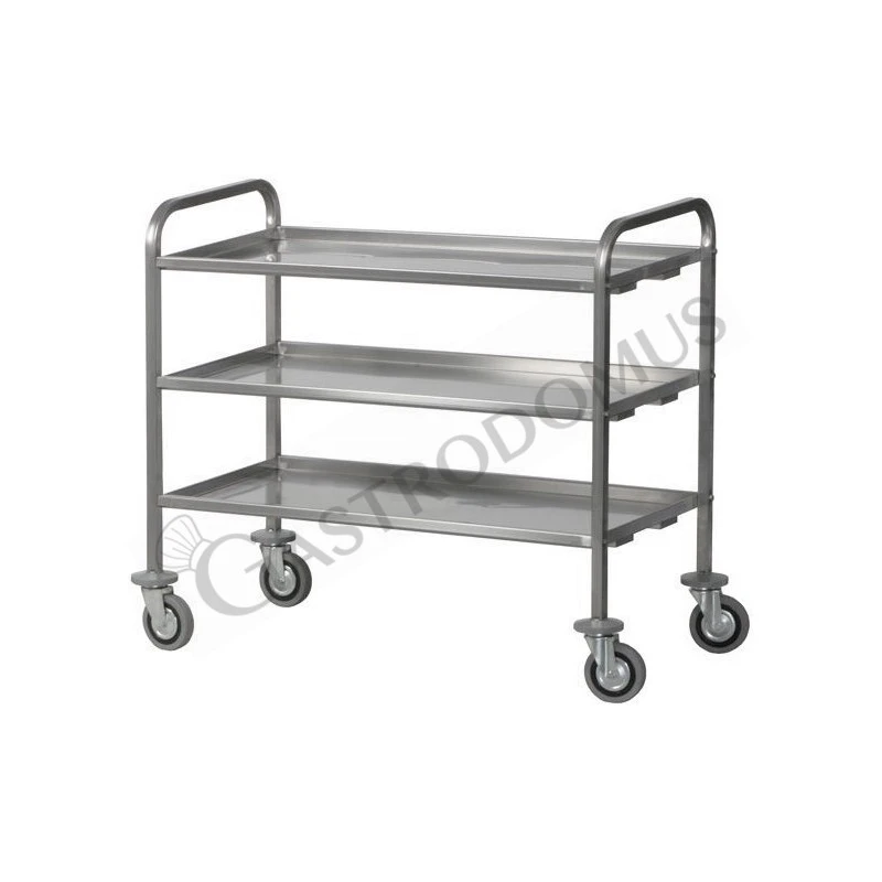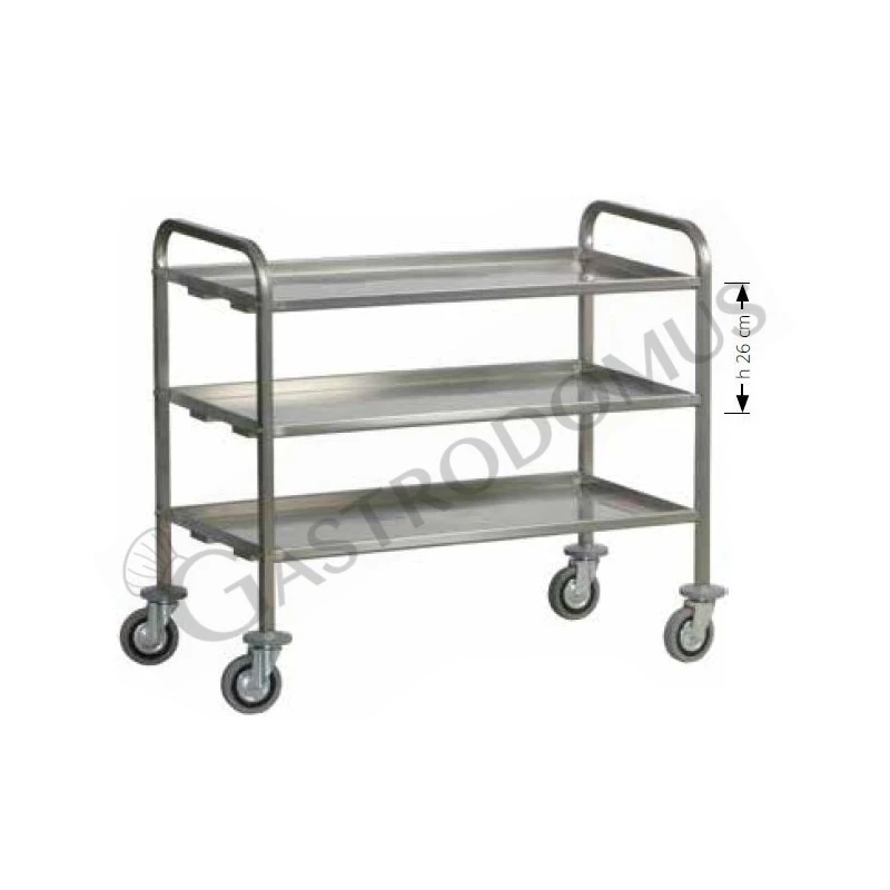 Il carrello ha una struttura tubolare in acciaio inox AISI304 25×25 con tre ripiani in acciaio inox AISI304 piegati con omega di rinforzo, satinati, insonorizzati.