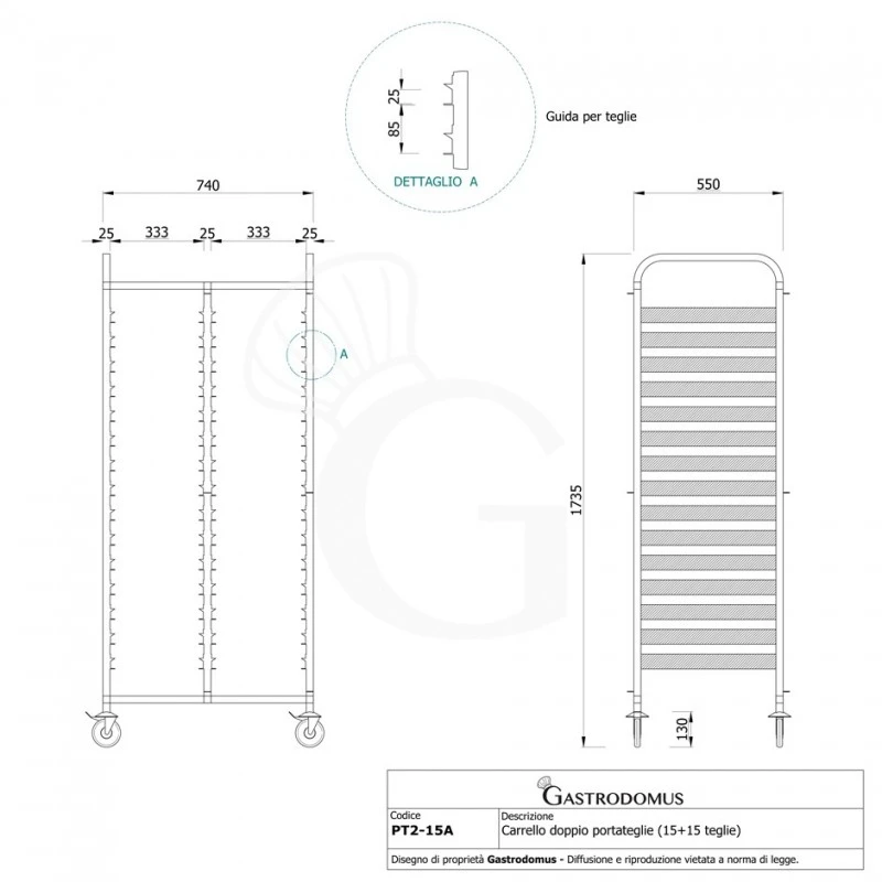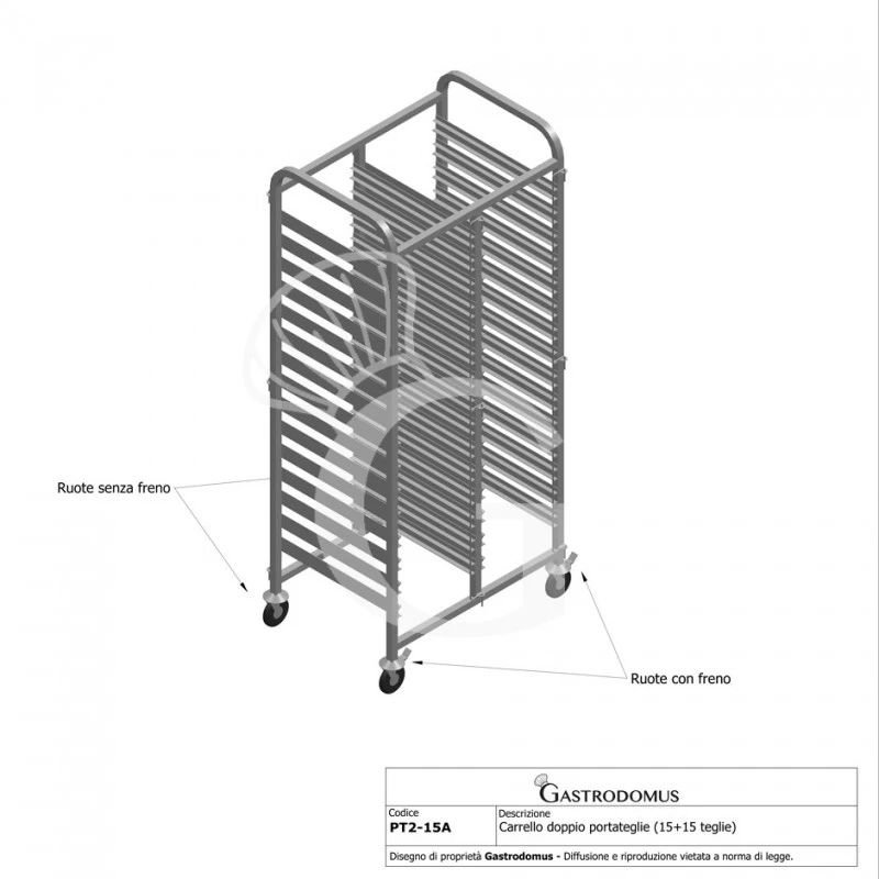 Carrelo doppio portateglie per 15+15 teglie GN1/1 – L 740 mm x P 550 mm x H 1735 mm.