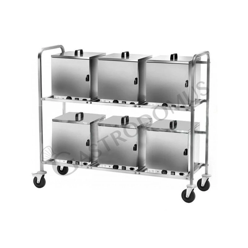 Ha guide per contenere 6 cassette termiche e ruote di diametro 125 mm di cui 2 con freno.