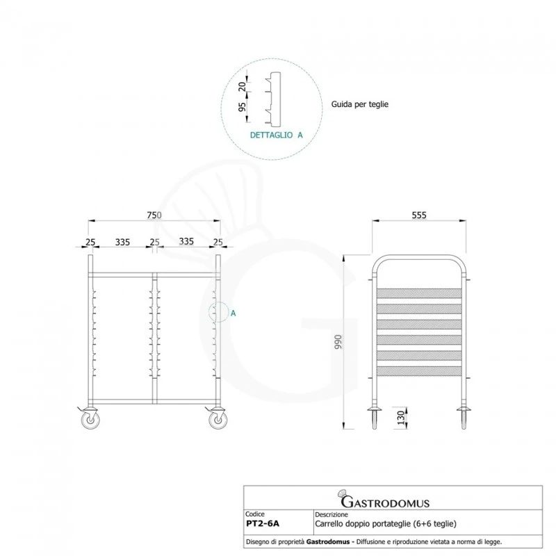 Carrello portateglie doppio per 6+6 teglie GN1/1 – L 750 mm x P 555 mm x H 990 mm.