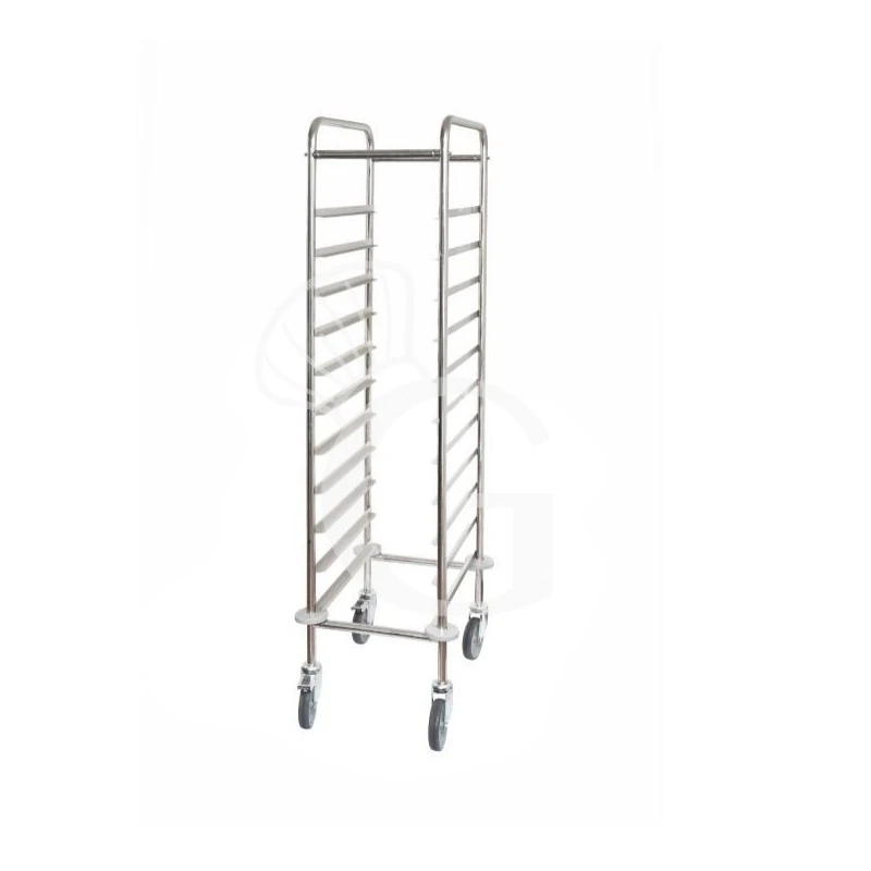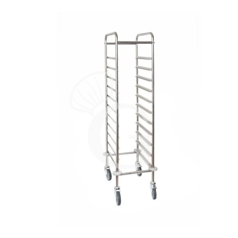 Carrello portavassoi in linea in acciaio inox per 11 vassoi di tipo Gastronorm di dimensione massima L 530 mm x P 325 mm. Dimensioni carrello L 455 mm x P 620 mm x H 1525 mm e passo guide 110 mm.