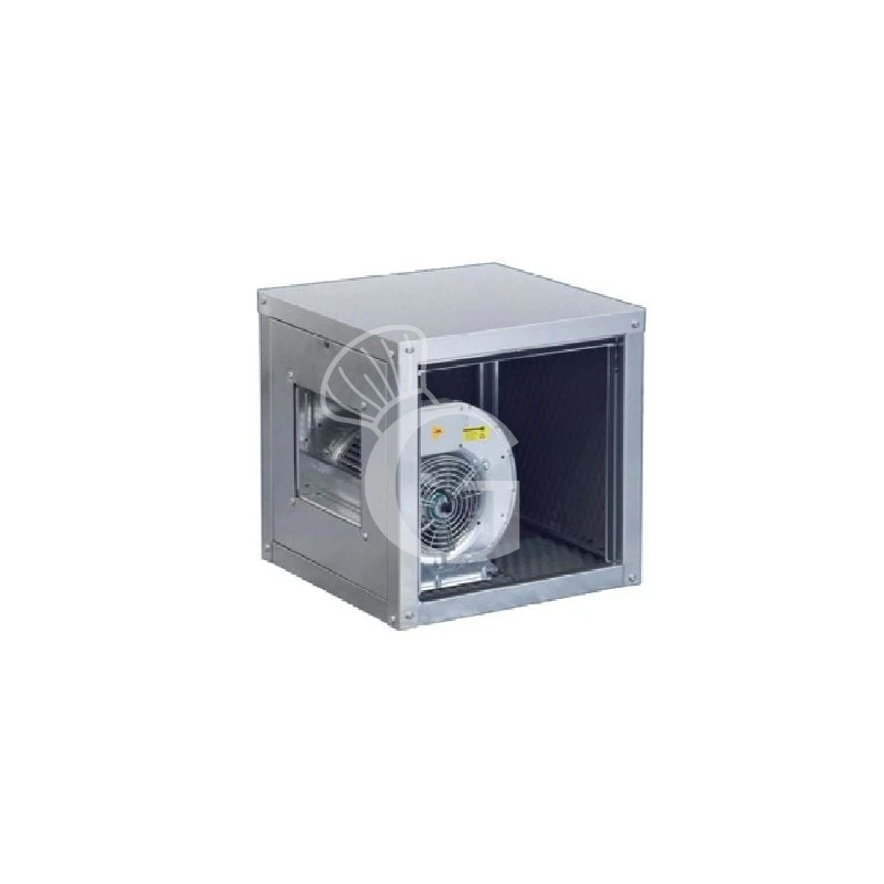 Cassa ventilante costruita in lamiera di acciaio zincato, isolamento acustico ignifugo (M1), ventilatore centrifugo a doppia aspirazione accoppiato alla girante a pale avanti equilibrata dinamicamente e motore IP44, classe F.