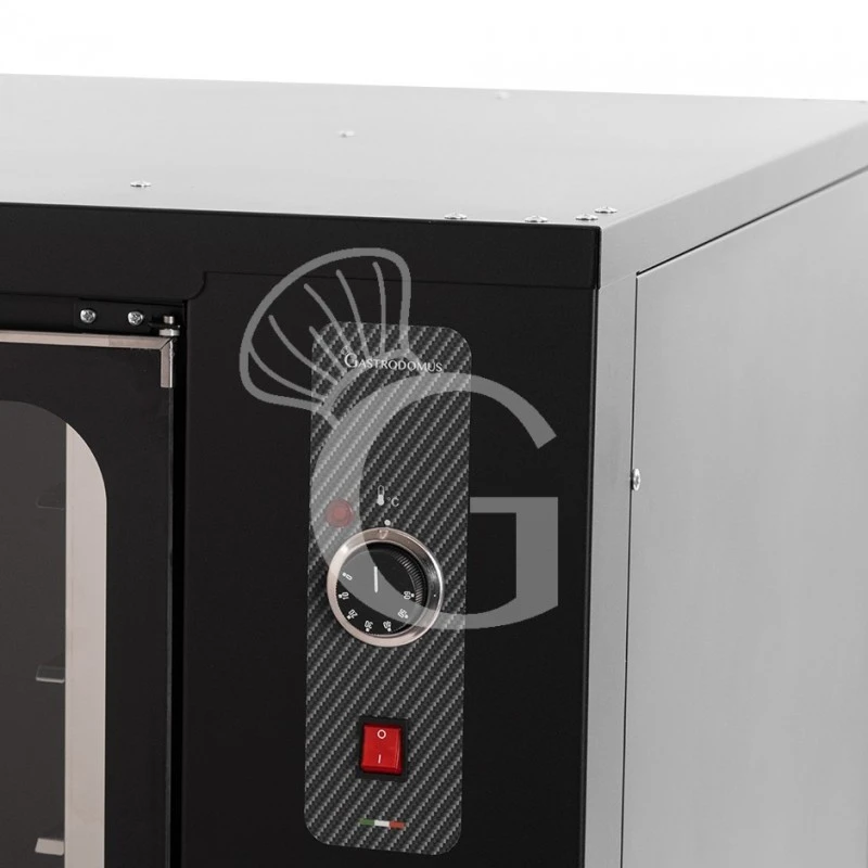 Nel pannello dei comandi, oltre alla manopola regola temperatura, sono presenti il tasto ON/OFF e una spia luminosa del termostato. Quest’ultima si illumina quando gli elementi riscaldanti sono accesi e la temperatura interna alla cella è inferiore al valore impostato dalla manopola – termostato. Quando invece la spia si spegne, significa che il riscaldamento è spento e che il lievitatore ha raggiunto la temperatura desiderata.