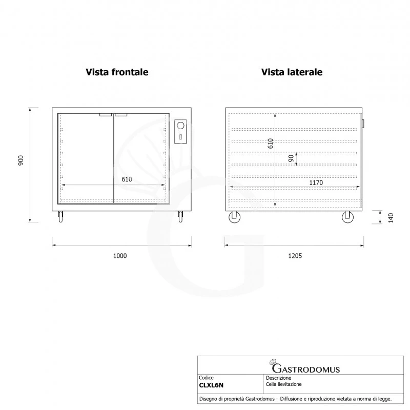 Il lievitatore può contenere fino a un massimo di 12 teglie delle dimensioni di 600 mm x 400 mm e lo spazio tra le teglie è di 90 mm.