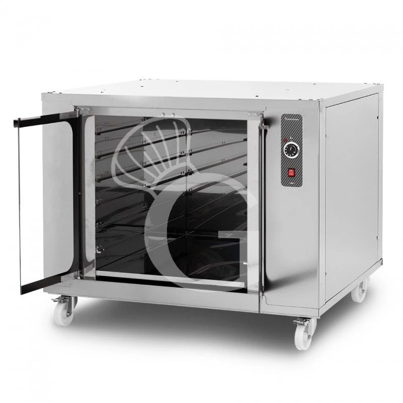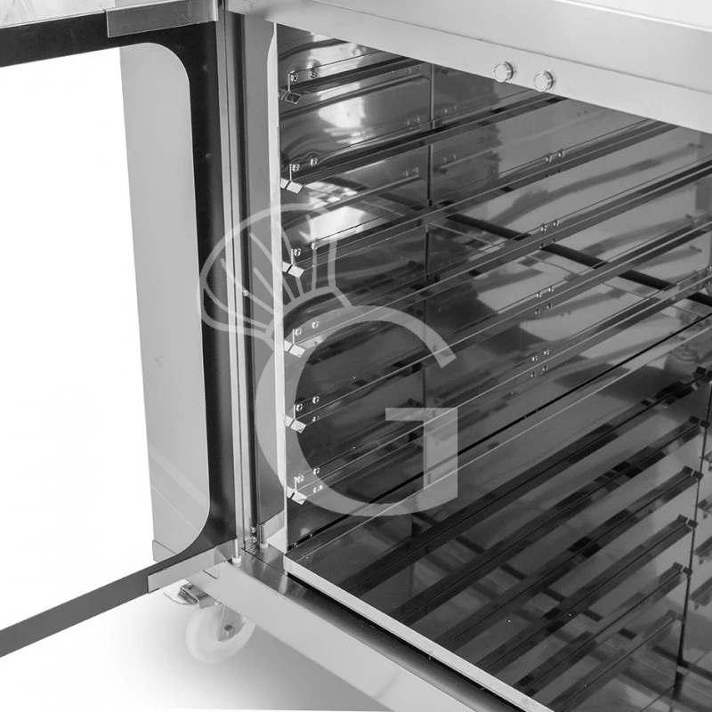 La cella di lievitazione ha una robusta struttura esterna in acciaio INOX-AISI403 ed è dotata di ruote (2 ruote con freno e 2 ruote senza freno) e di una porta in vetro per poter visionare in ogni momento l’interno della cella.