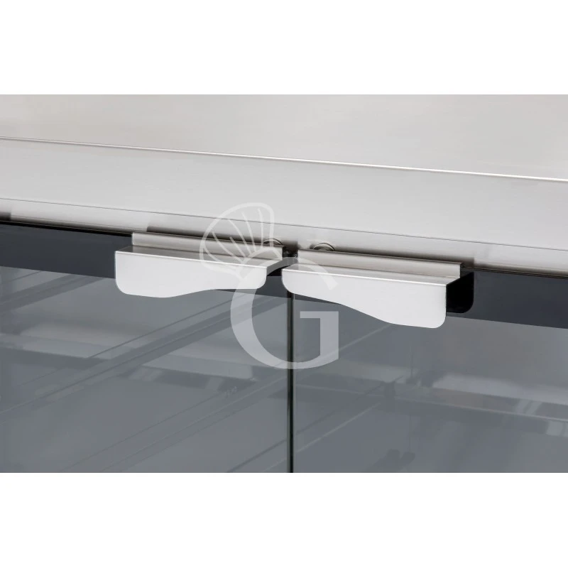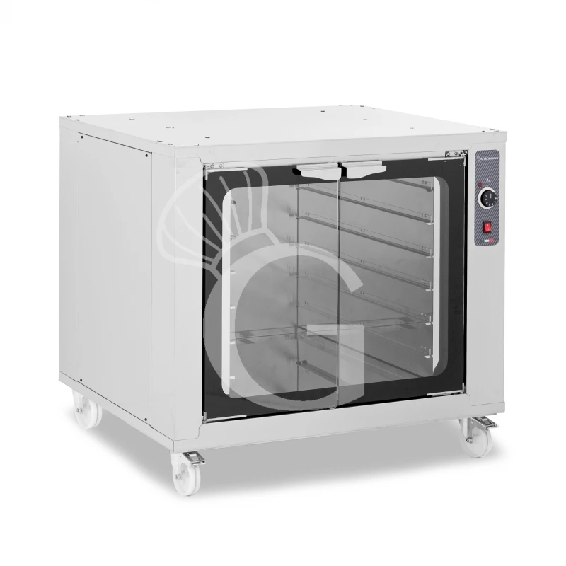 La cella di lievitazione ha una robusta struttura esterna in acciaio INOX-AISI403 ed è dotata di ruote (2 ruote con freno e 2 ruote senza freno) e di una porta in vetro per poter visionare in ogni momento l’interno della cella.