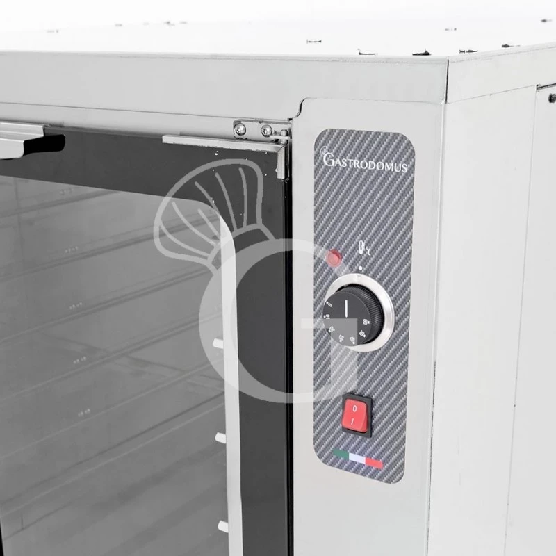 Nel pannello dei comandi, oltre alla manopola regola temperatura, sono presenti il tasto ON/OFF e una spia luminosa del termostato. Quest’ultima si illumina quando gli elementi riscaldanti sono accesi e la temperatura interna alla cella è inferiore al valore impostato dalla manopola-termostato. Quando invece la spia si spegne, significa che il riscaldamento è spento e che il lievitatore ha raggiunto la temperatura desiderata.