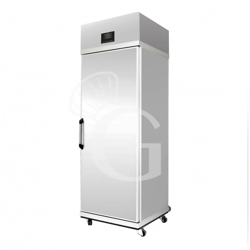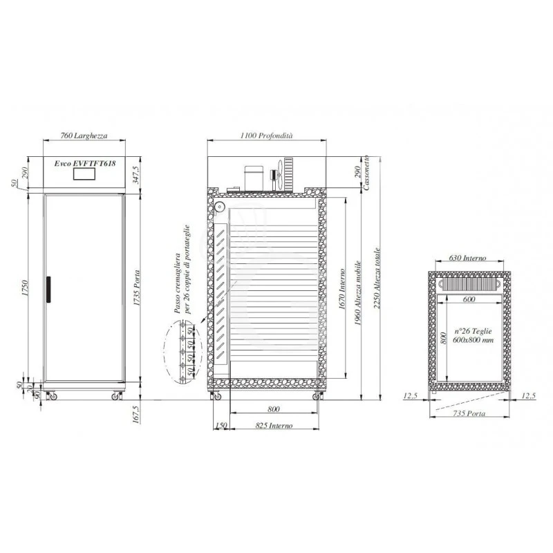 Armadio frigorifero ventilato fermalievitazione con temperatura regolabile da -5°C a +30°C, dimensioni lunghezza 760 mm x profondità 1100 mm x altezza 2250 mm, capacità 870 Litri, predisposto per 26 teglie 600 mm x 800 mm o 52 teglie 600 mm x 400 mm.