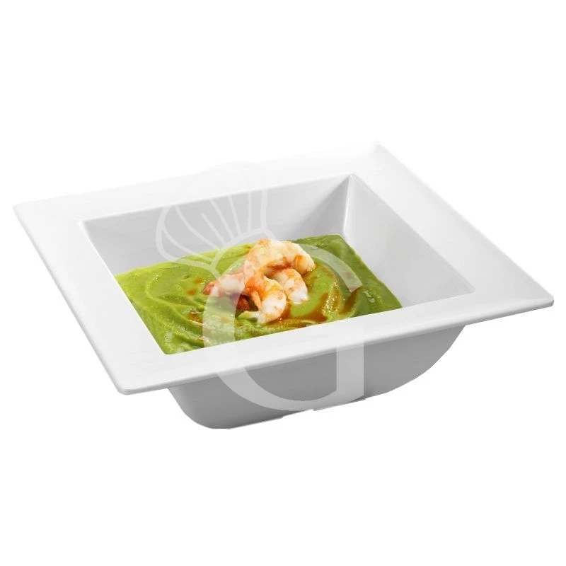 Ciotola quadrata in melamina, resina sintetica che si indurisce e prende forma dopo un processo di riscaldamento. È un materiale consigliato e utilizzato per i servizi in Tavola e Buffet.
