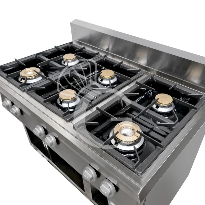 I bruciatori sono rapidi con rubinetti a gas valvolati in sicurezza con termocoppia e con fiamma pilota. Il piano di cottura a gas possiede 4 bruciatori con potenza 3,7 Kw + 2 bruciatori con potenza 5,5 Kw.
