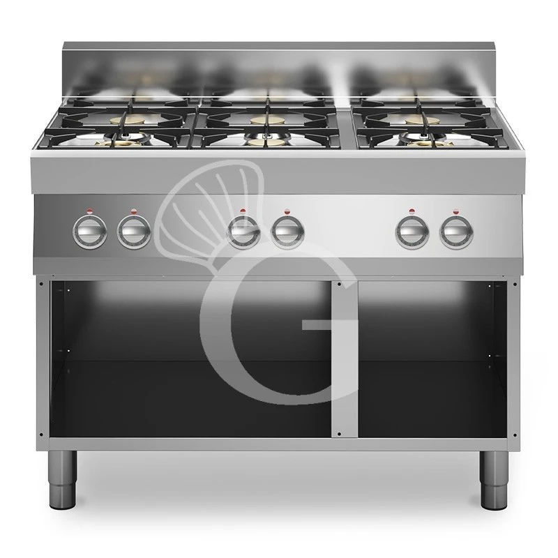 Cucina a gas con 6 fuochi su armadio aperto, profondità 700 mm.