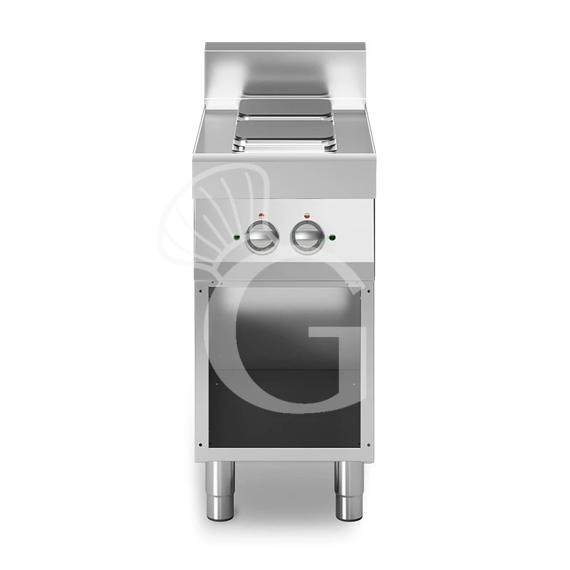 Il piano di cottura è dotato di 2 piastre elettriche in ghisa quadrate fissate ermeticamente al piano che hanno misura 220 mm x 220 mm e potenza di 2,6 Kw ognuna. Le piastre hanno inoltre bordo in acciaio INOX a tenuta e ogni piastra presenta un commutatore con 6 possibilità di regolazione della temperatura di lavoro.