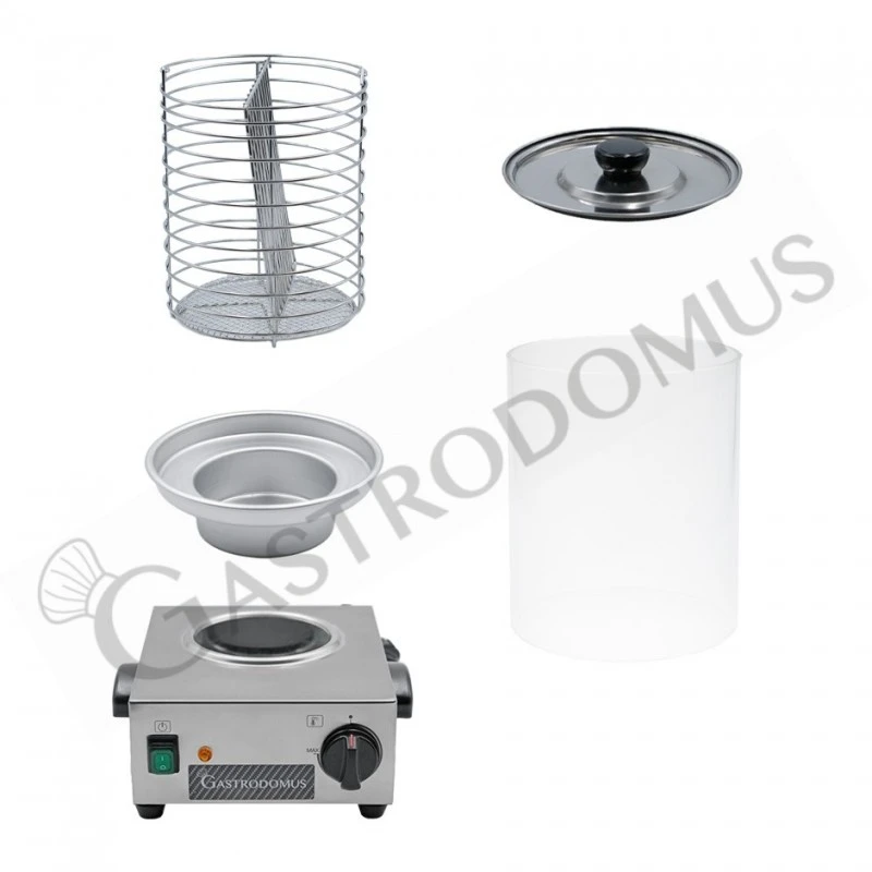 La struttura esterna è in acciaio inox. Una campana in vetro con all’interno un cestello in inox rotante permette una cottura dei würstel a bagno maria.