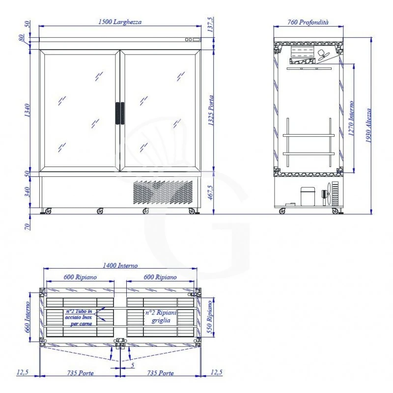 Espositore refrigerato ventilato per carne con dimensioni esterne L 1500 mm x P 760 mm x H 1930 mm, 2+2 griglie interne e temperatura da -5°C a +10°C.