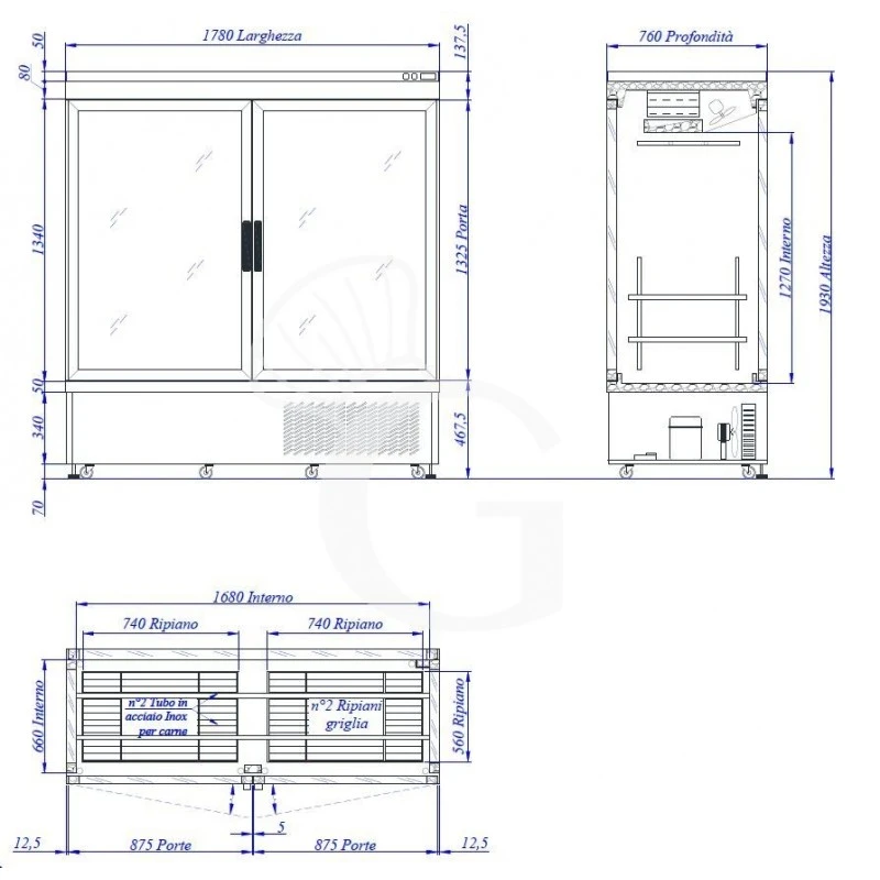 Espositore refrigerato ventilato per carne con dimensioni esterne L 1780 mm x P 760 mm x H 1930 mm, 4 griglie interne e temperatura da -5°C a + 10°C.